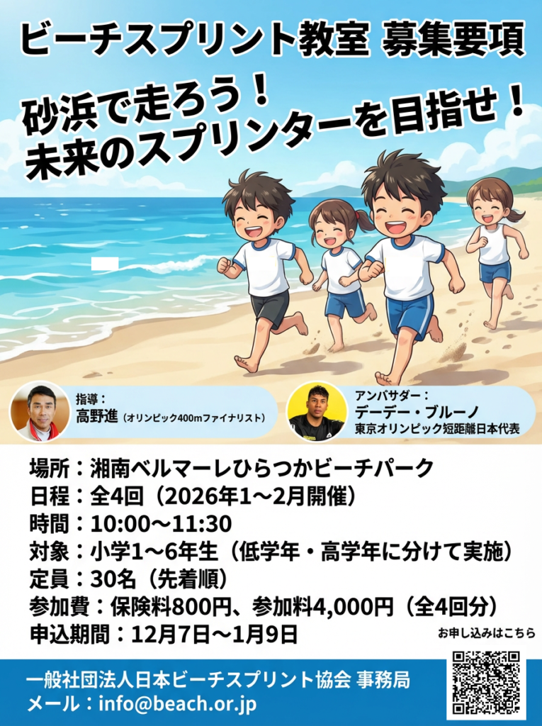 2026年1月11日(日)より、ベルマーレ平塚ビーチパークにてにてビーチスプリント教室開講いたします。